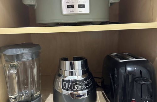 Each bedroom has a private full bath. One features a queen bed and the other has two full beds. The kitchen is fully stocked with everything you’d need for an extended stay.
