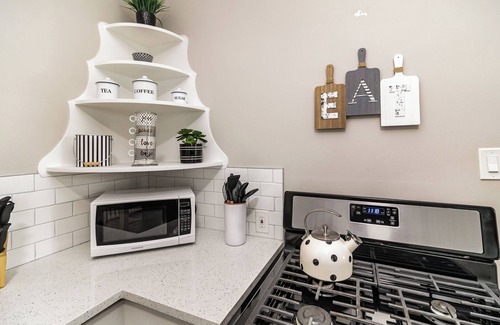 The kitchen includes a stainless-steel sink, quartz counter tops, new fridge/freezer, new stove, microwave, toaster, coffee maker, and blender. Dishware and spices/cooking oils are provided, along with coffee, tea, and sweeteners. Dining area seats 4 to 6.
