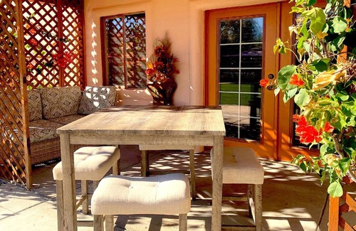 Southwest Two Story Casita for two. Warm Woodsey Living Room with Suede Sofa, 2 Fireplaces, Kitchette, Large Bathroom, Closet and Foyer. French Doors open to private Patio and rolling green courtyard with outside seating and fire pit for quiet mature couple. Beautifully Appointed Upstairs Master Suite has Fireplace and French Doors that open to a large balcony overlooking gardens with desert and Mountain views. Private Day Spa on-site with Spa Services by Appointment. Spa Robes, slippers and beach towels provided for boutique resort experience by heated Jacuzzi at the pool. Upon check-in guests are treated to a complimentary bottle of French Wine, cheese & fruit basket (or beverage of choice) to unwind at this unique relaxing retreat.