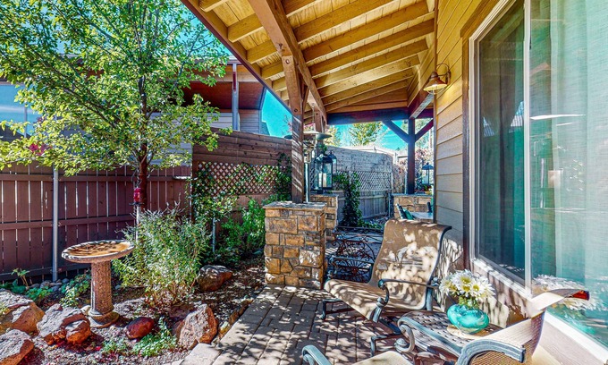 Nestled in the charming Presidio In The Pines Community in Flagstaff, AZ, this cozy Casita offers a serene retreat for your vacation. Featuring a spacious master bedroom with an en-suite bath, you are ensured comfort and privacy during your stay. Step outside the back door onto a private patio surrounded by lush gardens, perfect for enjoying your morning coffee or stargazing in the evening.