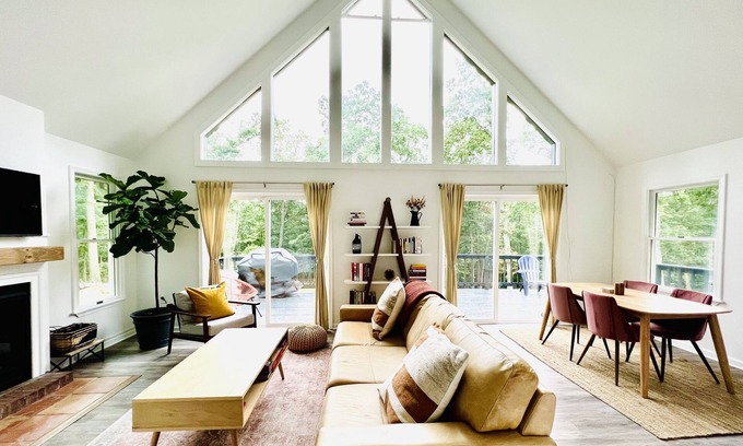 With 5-acres in the countryside, you'll enjoy star studded skies on clear nights & wake up to birds singing & deer wandering, with mountain views through vaulted windows.
