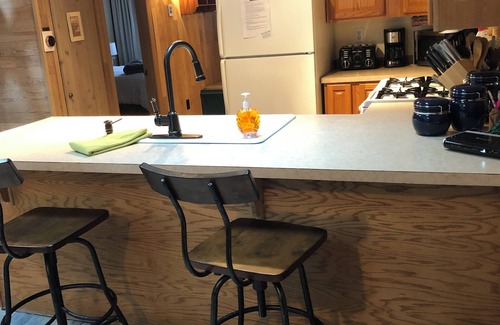 The propane stove does a nice job and sets the mood. The laundry room is by the front door, a good place to stash ski gear and pop it right in the dryer. Six people is the maximum, with one small bathroom, four or five people is comfortable.