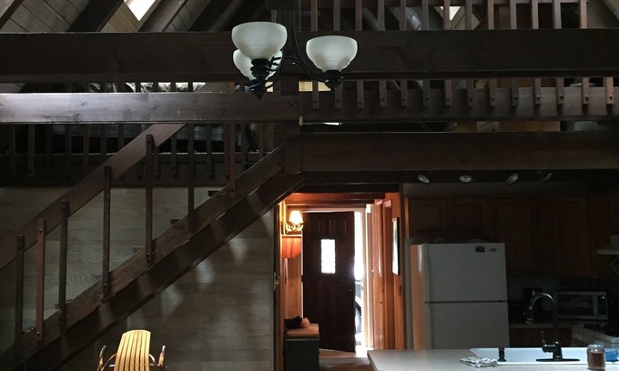The cabin has 1 bedroom with a queen bed on main floor and a large open rafter loft with a king and two twin beds. The beds are comfortable. The skylights let in some light and are openable.