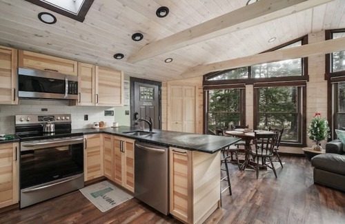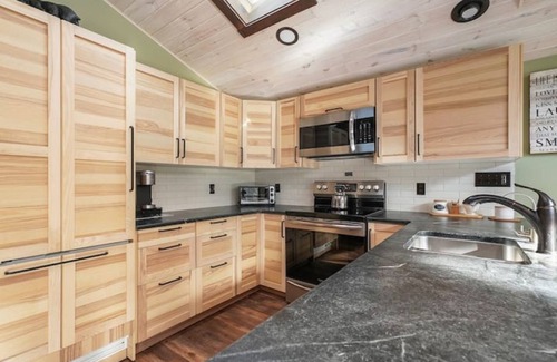 This renovated house has 2 bedrooms, 1 bathroom, washer and dryer, a loft and completely updated kitchen. The house has a spacious deck with a dining table and a propane grill. Backyard offers sitting area with the fire pit.