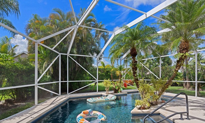 Our spacious pool area is truly a jewel, a private oasis that serves as an ideal setting for a relaxing family getaway or a memorable group vacation. Dive into the refreshing enclosed pool by the palm trees, bask in the Florida sun, or host an outdoor dinner with friends. The space is designed not only to soothe your senses but to create opportunities for fun, connection, and relaxation.