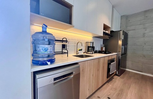 Brand new condo finished Jan 2023, with a fully stocked kitchen & outdoor Kamado BBQ. King bed in master, Queen & 2 individual (1.5 plaza) beds in secondary room. Fast fiber wifi, 75" Smart TV, & A/C. Access to Cowork desk, pools and gym on-premise. Longer stay discounts!