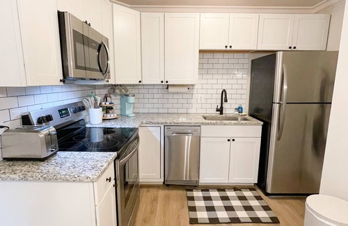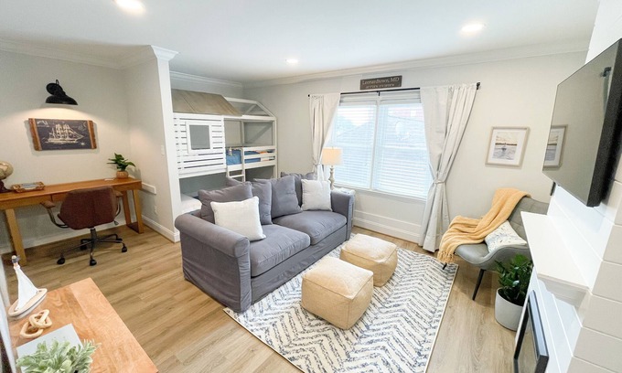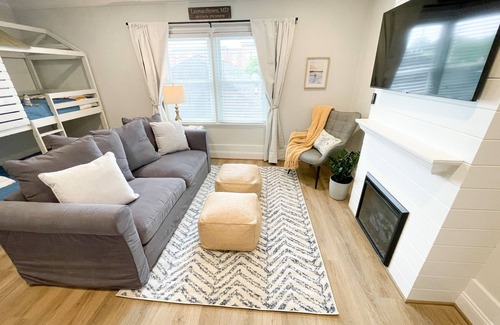 This cozy one bedroom apartment is the perfect place to unwind & relax. Located in the heart of downtown Leonardtown, the Retreat at Fenwick is steps away from many delicious dining opportunities, unique and fun shopping at local boutiques, and fun entertainment experiences. It includes free wifi, a full kitchen & complimentary coffee bar, a charming eat-in dining space, full size pull out sofa bed, a cozy electric fireplace, a sleek workspace, and whimsical bunkbeds that are great for kids!