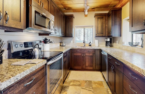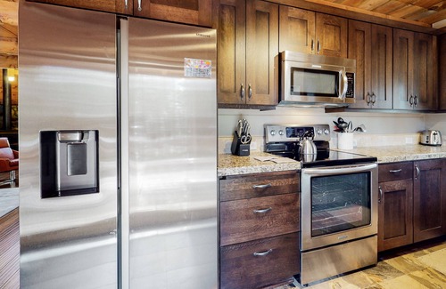 Adorned with fun pops of color, warm wood finishes, and modern furnishings, the interior of your retreat embodies a welcoming aura. Throw a log on the wood-burning stove and cozy up on the soft sofa while tuning into your favorite movie with a loved one.