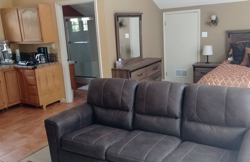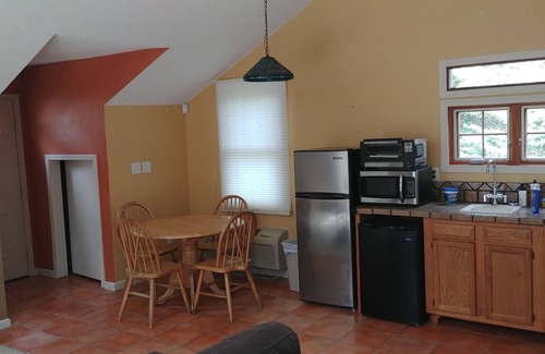 The suite will sleep 5 comfortably, but we have an inflatable mattress to accommodate two more. It features all-new bedding and furniture, including one queen bed, one pull-out sleeper sofa (queen), one pull out sleeper chair (single), dresser, chest of drawers, and large LCD TV (with Dish), and gas grill. The kitchenette includes a mini-fridge, microwave, toaster oven, coffee maker, and two-burner hot plate. The bathroom has a walk in shower and vanity. Previous guests should note we have upgraded the HVAC in the suite to a quieter and more powerful unit, as well as new decking
