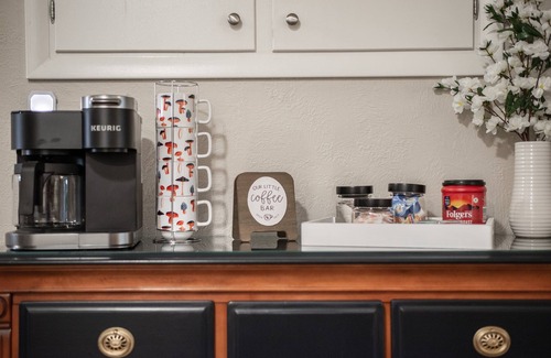 Kitchen is well stocked and includes a coffee bar with a Keurig coffee pot (12 cup carafe and single cup pods)!