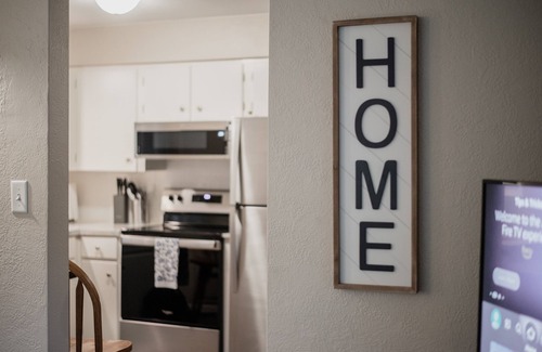 The living room has comfortable seating options along with an Amazon Fire TV with Netflix and Prime Video for you to stream your favorite shows!