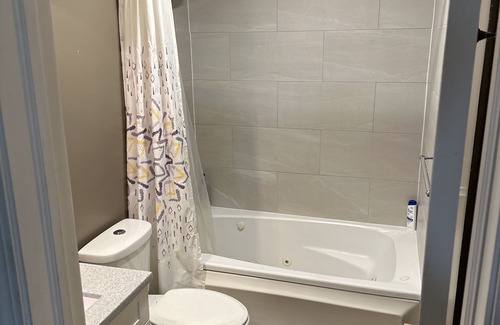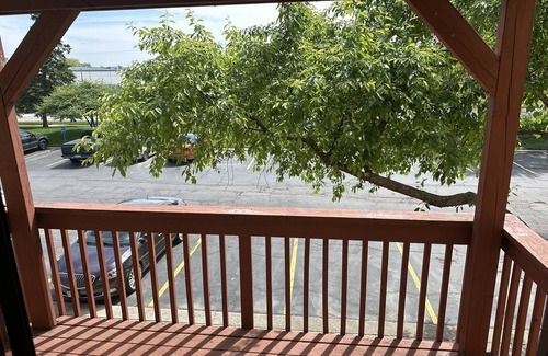 Cozy condo located near the Chicago premium outlets and mins away from downtown Hollywood casino downtown Aurora enjoy the spacious large jetted tub with an inviting porch view with an king size bed and comfy sectional
