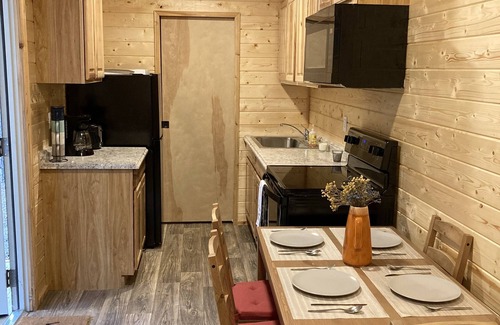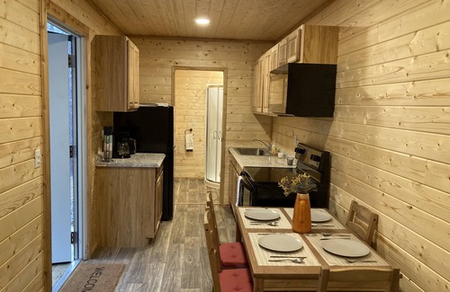 The cabin is new and includes a private bedroom with a queen bed. The couch converts into an extra bed that can sleep two. Tankless water heater provides instant heat for your showers. Covered patio downstairs and top deck sitting/viewing area. Outdoor gas grill, fire pit, oven, stove, microwave, toaster, coffee maker, and refrigerator. The cabin is stocked with cooking essentials as well as plenty of coffee. Due to its remote location, cell service is limited and based on your individual cell provider.