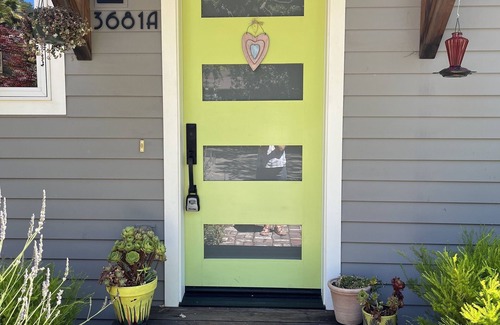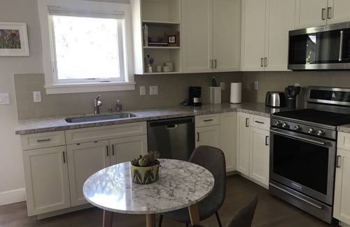 Built in 2018, this beautiful cottage has new appliances including washer/dryer. It's located on a quiet sunny lot near a creek, and has off street parking. Clean lines, and uncluttered living space are paired with all the essentials needed for cooking a meal at home. TV, WiFi, and internet are included. Enjoy the outdoors on the private shaded patio.