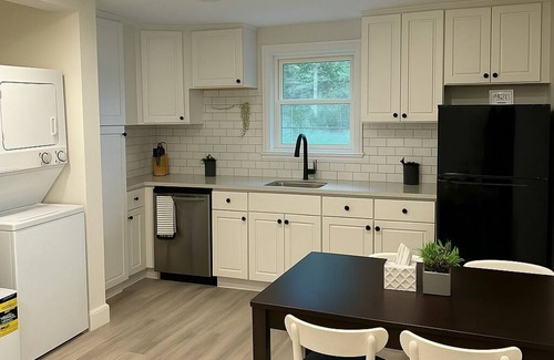Prepare delicious meals in our modern kitchen equipped with top-tier appliances including a dryer, washer, refrigerator, stove, oven, and coffee maker.