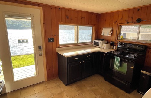 The cottage has tile floors throughout, a bathroom with stand-up shower and kitchen with full size range, oven & dishwasher. There is sofa seating and a dining table in the living area with a huge picture window overlooking the water. The cottage has two bedrooms - a queen-sized bed in one room and two twin extra-long beds (built-in bunks) in the other. There is also a converted boathouse overlooking the water that is a great place to hang out and have some extra covered space. The boathouse has a sofa bed, large TV and games, and a window AC unit (however, it has no heat and there is no separate bathroom in this structure).