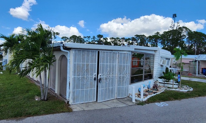 CUTE LITTLE BEACH HOME in Sunseekers RV park. One bedroom. is in a community with a tiki style pool, pickle ball, shuffle board, 2 dog parks, BBQ and laundry facilities Can sleep 4 w/blown up queen bed (if available) Queen temper pedic bed & Futon couch folds down. New leather love seat w recliners. All the amenities needed for cooking at home. Few steps away from pool! Unit is right next to it! 10 mins away from I75 to get to Fort Myers beach, which is only a 30min drive!! 5min drive to the beautiful Shell Factory. 20 minutes from Punta Gorda and FT Myers Airports. Grocery store is 1 mile down the road. Minutes from Pine Island and Matlacha