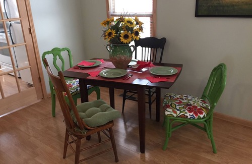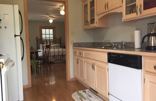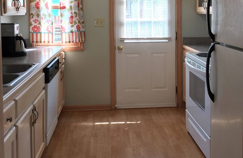 There is a queen size bed in an open room with the dining table near the kitchen. A futon sofa in the living room can convert to a comfortable full size bed. The futon sleeps 2 children or one adult comfortably. Two newly remodeled bathrooms with showers means no wait! Some toiletries such as shampoo, conditioner, and lotion provided. All linens provided. If you would rather stay in and cook no problem! The well stocked kitchen has everything you need, and the dining table seats 4. There is a coffeemaker and coffee and tea available. An armoire is available for clothes. There is a desk in the living room and WIFI is available. Kick back and relax in the living room with a book, watch ATT TV, or a DVD. We love our little cottage and hope you do too!