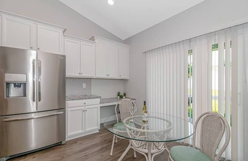 Our Beautiful fully equipped; fully stocked kitchen has everything you need to create delicious meals if you decide to dine in while you are on vacation. Featuring BRAND-NEW stainless-steel appliances (gas stove, oven, microwave, double sided refrigerator with bottom pull out freezer & dishwasher), a Keurig coffee machine. Our kitchen features a eat at bar with barstools and a breakfast nook inside the kitchen with a round dining table that will accommodate 2 guests, along with a small desk space you can work at as well.