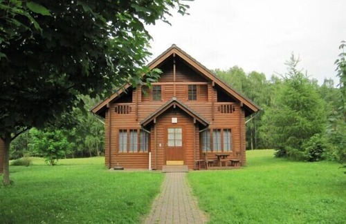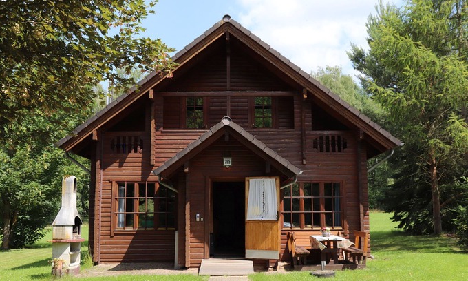 Cosy wooden house up to 9 people on the edge of the holiday village at Silver Lake in the north Hessian mountains Frielendorf.