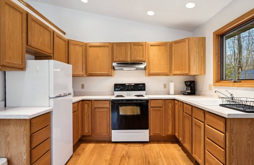 The kitchen is fully equipped with a refrigerator, Stove, Microwave, Coffee Pot and Toaster. We also include some pots, pans, crockpot, strainers, cups, plates, mugs, wine glasses, Tupperware (please don't take), silverware and other basic baking supplies