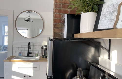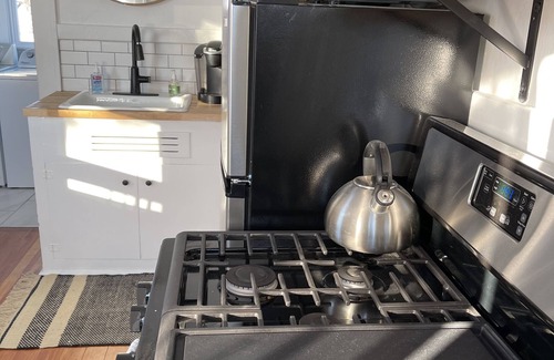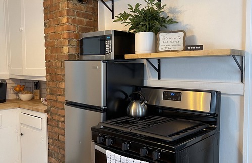 Restored, original wood floors from 1929 throughout, as well as the exposed chimney and cupboards in the kitchen. Your loaded kitchen also features butcher block counters, stainless steel appliances, tile backsplash, open shelving, Keurig, traditional coffee pot, toaster oven, and anything else you might need to make a meal for yourself while you enjoy your stay.