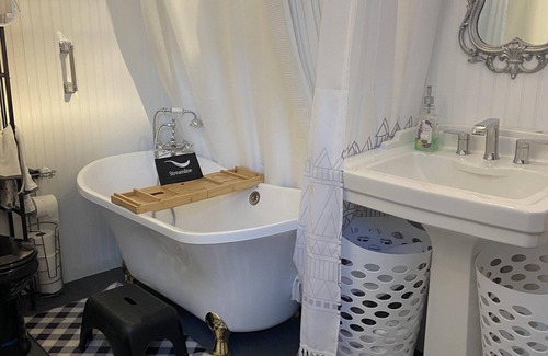 Private studio apartment overlooking garden area, small deck with table for outdoor dining. claw foot tub, and comfy bed .