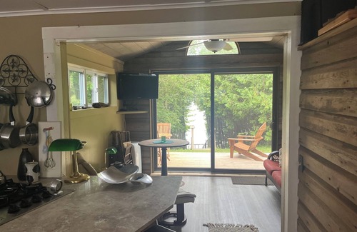 Full kitchen, WiFi, bath with shower, flat screen TV, queen bed, and extra futon. Outside propane grill, screened-in porch attached to camp, and additional large deck down the wooden walkway, which overlooks the lake and includes plenty of outdoor seating. There is also a campfire ring by the camp for toasting s'mores (wood can be purchased locally by the bundle).