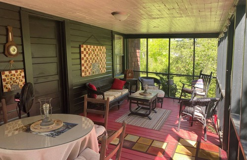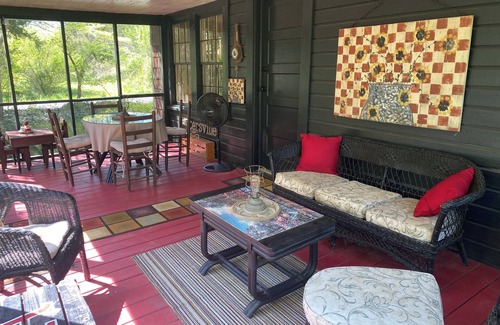 Located in Adairsville, just a half mile from Barnsley Resort's main entrance, you'll enjoy a peaceful, pastoral setting on the screened front porch or by the creek running through the property. It's a two bedroom, one bath cottage and pet friendly. We provide "pup towels" and don't even charge a pet fee! One bedroom has a king bed and smart TV and the other has a queen bed. The kitchen is fully equipped, including drip and single-serve coffee makers. Coffee, creamer and sweeteners are provided, as are ample paper supplies. The living room has a fireplace with electric insert - just for ambiance - and a smart TV. There's wireless internet, central heating and air, and a washer and dryer. The bathroom is a tub/shower combo and is equipped with a hair dryer, body wash, shampoo and conditioner, and plentiful bath towels. There's ample parking and self check-in is a breeze. Bring a bike and enjoy miles of quiet country roads. Also, just across the road, amenities available to day guests at Barnsley Resort include golfing, spa treatments, horseback riding, shooting and dining.