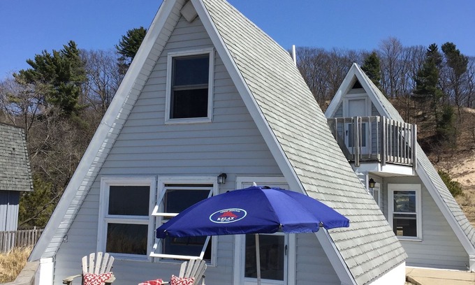 Nestled on a sandy dune, just a few easy steps from beautiful Lake Michigan, Blue View Cottage is a perfect family retreat. A vintage A frame, it's been completely renovated to house 8 people comfortably. It maintains a rustic charm, while providing brand new amenities.