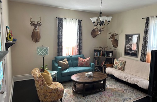Located in Washington Court House, this cottage is a dream. Bring your pets! Kids have plenty of art supplies and games. With its excellent location, guests can easily access HWY 71 to explore all the major cities in Ohio within an hour or so. The cozy bedroom offers a comfortable retreat after a day of adventures. The property also features a lovely living room with a futon, providing additional space for relaxation. Stay connected with Wi-Fi, and enjoy the convenience of amenities like a gym, washing machine, fire pit, art center, bar, hammock and AC. Whether you're working nearby or simply unwinding in the beautiful surroundings, you're sure to make fantastic memories with a stay at our place. We hope you will love this eclectic home as much as we do!