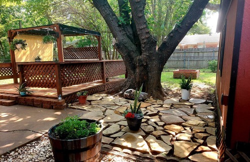 This cozy cottage style home offers so many amenities! Very comfortable beds! Great AC and Heat! Nice hardwood floors throughout the home, with a beautiful, custom-made decors, including hand painted headboards! The backyard is almost magical, with a nice, covered wood deck, seating for 6,under huge shade trees! Large patio for grilling and visiting under the shade tree. New indoor/outdoor grill! There is a Flagstone Breezeway adorned by potted plants and metal art. You feel soothed and rested by the comfort of the breeze, wind chimes, and the trickling sound of the water fountain close by! There is a friendly woodpecker that will chat with you at times, welcoming you to his surroundings! To the right, you will find the complete makeover transition from a storage building to a She Shed that will sleep 4. The home has 3 bedrooms but the She Shed will give you 1 more private area if needed. A lot of time and work has gone into this space, and I hope you find it magical too!The Shed Shed does have a 75.00 added fee for your entire stay if you wish to use this space. The loft has a comfortable gel queen mattress, and the living room has a fold down Futon. This space will sleep 2 to 4. Just down the street is Jaycee Park, which is walking distance, and the Lighthouse coffee cafe is just across the street. there is no need to get into your car! They have live music on the weekends as well! Just a mile down the road is the downtown Midlothian, we have lots of nice shops, and fabulous eateries! Be sure to visit the Founders Row, with a fine Seafood restaurant and several more! For night life, the Union 28, has a restaurant and outdoor music! Heavens attic is a nice resale shop, that you're sure to find something you'll want to take home!The garage is included, so you have extra parking. All Led lighting throughout the home and motion lights for nighttime passage. Located a mile to shopping in downtown Midlothian, schools, and HWY 67. The home has many amenities, including full kitchen appliances, new pots and pans, dishes, charcoal, and electric grills! Stocked bathrooms with new towels, bath gels, shampoos, conditioner, cotton, Q-tips, facial wipes, etc. The garage space will fit 2 small cars.The driveway will hold 4 vehicles. If you have any questions, feel free to ask! There is also extra folding blue cushion beds in the bedrooms that can be used in the living room, for added sleeping area!There are 2 close wedding venues, one down the street, called Bella Woods, it beautiful and they rent their venue out for many other things too! Check it out if your not pressed for time! Another venue is Blainestone Lodge, just 8 miles south! Both are beautiful, and convenient to this home!i have included pictures of both at the bottom list of pictures!Thanks for considering The Moon Flower Inn!