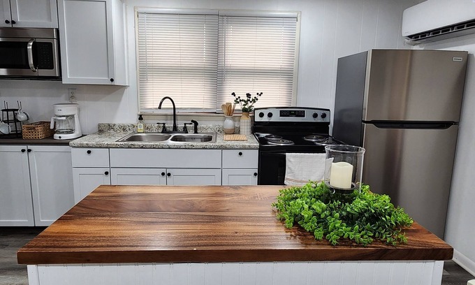 The cottage is a great place to stay! We kept the original hardwood floors in the living room. There is a full kitchen with a live edge countertop island. Washer and dryer. Wifi. Off street parking. Corner lot with a yard and a clothesline :). Conveniently located to all the major plant sites which is perfect for travelers.