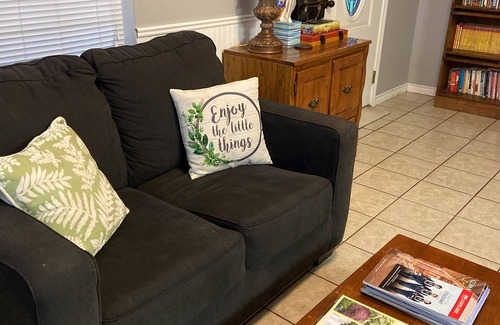 Guest house located on 60 acres near DeLeon in beautiful, rural Comanche County. Surrounded by green pastures and cattle, this is a peaceful country getaway centrally located between Stephenville, Comanche, and Eastland. Enjoy farm animals on the property, including chickens, cats, dogs, and cattle.