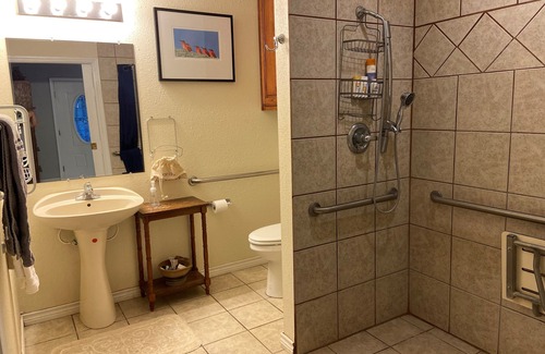 The guesthouse is equipped with a full kitchen, living/dining room with a twin size sleeper sofa, an ADA accessible bathroom, and one bedroom with a queen size bed. Private front porch with rocking chairs.