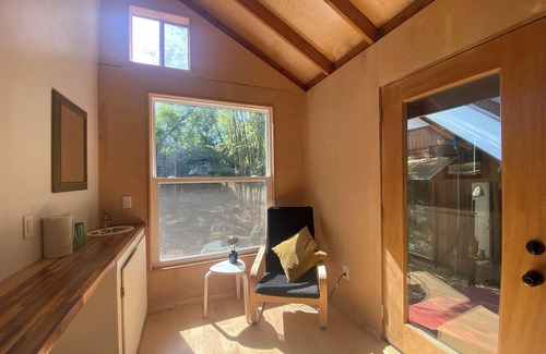 A 20-second walk across the yard from the cottage's front deck, is the additional bedroom dubbed 'the casita'. Remodeled by the artist-owner, the casita houses a custom-built platform queen-sized bed, and small sink for daily ablutions. The space gets great light, thanks to many windows and glass doors. A small space heater helps this well-insulated tiny home get toasty quick in the winter, while the overhead fan and large windows allow it to cool in the summer.