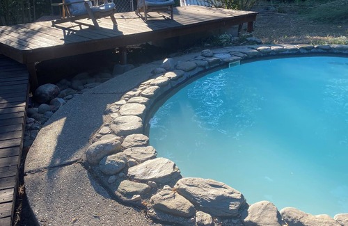 A highlight of the property is the soaking pool and sauna! About 4 feet deep, the small, in-ground pool is ideal for languid afternoons or cooling off after a hike. If you want the full spa experience, you can fire up the rustic wood-fired sauna (if interested, please ask the host for guidance on how to use). The sauna pairs perfectly with the pool as a cold plunge during the colder months. Surrounded by decks, this is a great spot to take in the property views while relaxing in a lounger. There is also an adjacent fire pit that guests are welcome to use outside of dry season (December–April) .