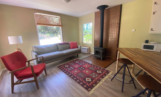 You are free to wander the grounds and check out the variety of fruit trees and native plants. There are unpaved pathways between the driveway, cottage, and casita. The terrain isn’t extreme, but it is uneven and could be challenging for guests with mobility issues. This property is not ideal for elderly guests.