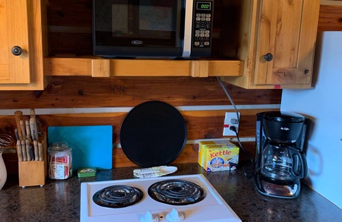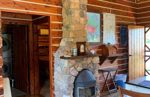 The cabin has heating and air-conditioning, electric, a wood-burning fireplace, hot and cold water, a heated tile bathroom floor. Gas and charcoal grills bring your own charcoal.