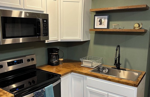 Inside, you’ll find a warm, thoughtfully designed space with a fully equipped kitchen, spacious living room, queen bedroom, private queen loft and beautiful bathroom.