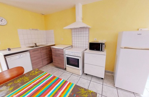Business stay: 4 people max. - Cleaning options (1/stay from 1 to 14 nights) and linens are required. Heating is based on meter readings > 8 kWh, payable to the owner. Your accommodation is all on the ground floor (with 2 steps between the living room and the sleeping area). 40m² living room with a fully equipped kitchen area (dishwasher, refrigerator, freezer, oven, 3 gas and 1 electric burners, microwave, filter coffee maker and pod coffee maker (Senseo type), kettle, toaster) and a lounge area with a sofa, coffee table, and 41" TV. A bathroom with a walk-in shower (access width 68cm) and sink. Laundry room with washing machine. Separate toilet. 4 bedrooms: 3 with a 140x190cm bed each and 1 bedroom with a 90x190cm bed. Only 1 bed without a footboard (140x190cm).