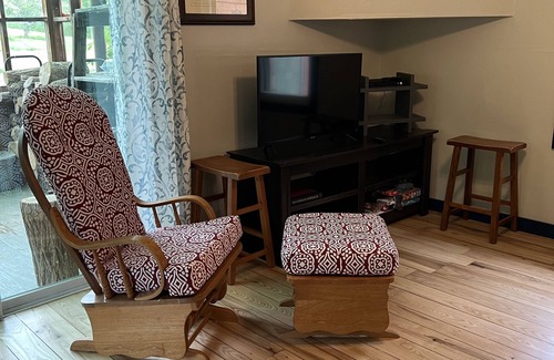 Come immerse yourself in nature in our cozy country cabin. Inside fully stocked kitchen with brand new, full-sized appliances including a washer and dryer. Indoor Entertainment: cards, some board games, colored pencils and paper, TV with DVD player w/several discs, a book self. Outdoor fun: badminton net and gear, hammock, BBQ grill, fire pit and picnic bench. Cabin is nestled among the trees. Two bedroom with 4 twin beds which can be snugged to make 2 kings, plus futon in living room.
