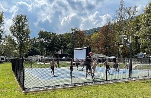 Our property sits along 1600 ft of the North Toe River (stocked with Trout) and is 10 miles off the Blue Ridge Parkway in Western North Carolina. Our Couples Cabin has beautiful views of our open grass fields, fishing pond and mountains. Enjoy s'mores by your fire pit any time of the year! Or grill out using our communal park style charcoal grills by our pond. You bring your own linens or a sleeping bags, your fishing poles, and your hiking shoes (the campground features 144 acres of hiking trails in the Blue Ridge Mountains.) The campground also has a laundry facility, arcade room (newly renovated with billiards, 4 pinball machines, air hockey, and arcade games) and a dedicated fiber service that provides free high speed internet all over the campground! We also added a basketball court and pickleball courts for our guests to enjoy. The campground also has a laundry facility, arcade room (recently renovated with billiards, 4 pinball machines, air hockey, and arcade games) and a dedicated fiber service that provides free high speed internet all over the campground! We also added a basketball court and pickleball courts for our guests to enjoy! Snow lovers we are only 12 miles from tubing at Jonas Ridge and 22 miles from Skiing at Sugar Mountain!