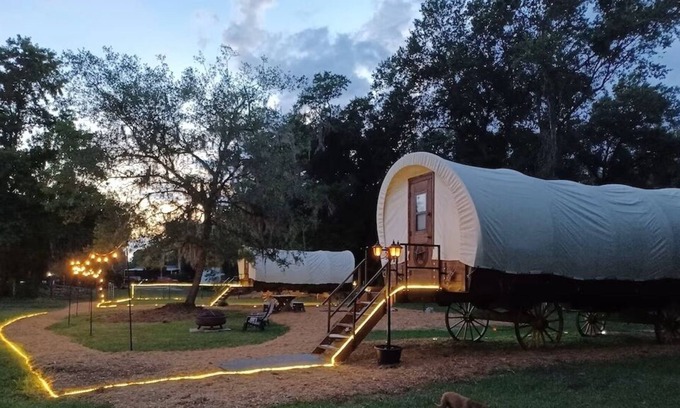 Cozy Covered Family Wagon on Rooterville’s Working Farm and Animal Sanctuary | Cabin in Melrose