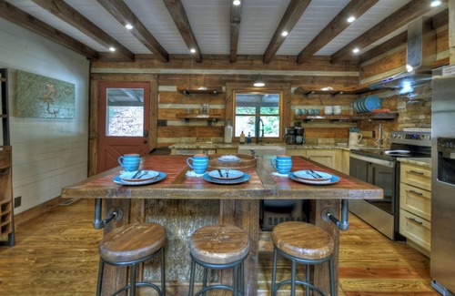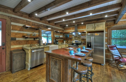 The deck, adorned with a spacious table, gas grill, and even a TV, presents an inviting space for leisurely gatherings and al fresco dining with loved ones. Crafted from custom wood, the cabin exudes rustic elegance throughout its interior, complemented by modern amenities for added comfort. This is truly a spectacular Blue Ridge cabin, that is ideal for a couples getaway or a small family vacationing in the Georgia Mountains.