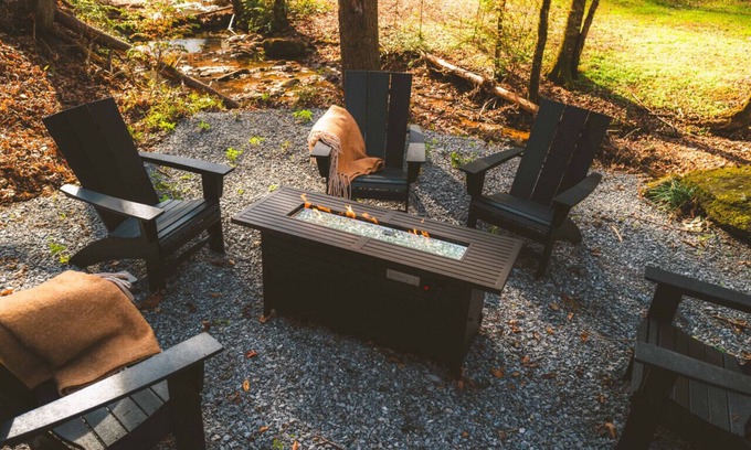 The expansive outdoor space includes a fire pit with ample seating, making it the ideal spot for gathering around and enjoying a cozy evening. A propane grill is also available, perfect for cooking up delicious meals in the fresh air.