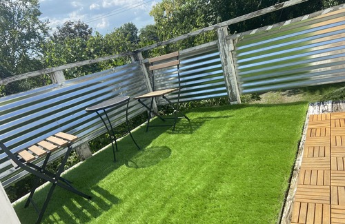 There are 2 large skylights - a private deck in the trees - a private driveway - a living room - bathroom with a shower- a kitchenette - and a bedroom. 700 sq ft.