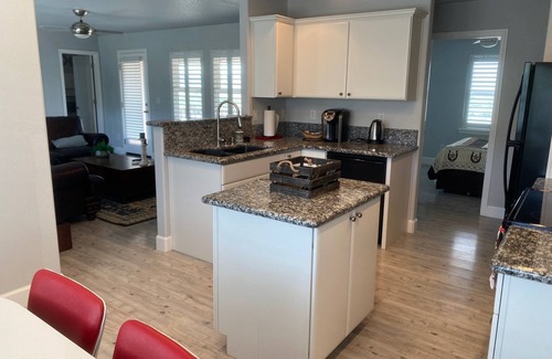This cozy and delightfully furnished bungalow features 2 bedrooms and 1 bath. Sleeps 4 adults and cots can be provided for the kids if requested. You will enjoy 360 degree views of the mountains with spectacular sunrises and sunsets. There is a full kitchen with dishwasher, microwave, Keurig coffeemaker, refrigerator and oven, along with many small appliances.