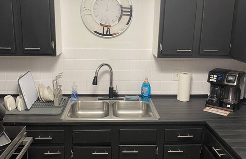 Enjoy a full-size kitchen with an electric range, coffee machine, microwave, and a small dining area for two. We provide the basics for your convenience — coffee, seasonings, condiments, and more. The bathroom has a shower/tub combo and basic toiletries. A laundry area is also available.
