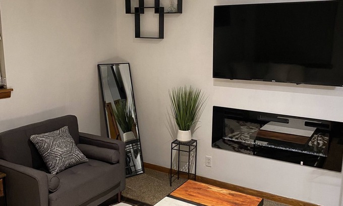 The living room offers a great entertainment area with everything you need to unwind. The first bedroom features a full-size bed and a mounted TV, while the second bedroom includes a futon couch/bed, LED lighting, and an office desk if you need to work during your stay.